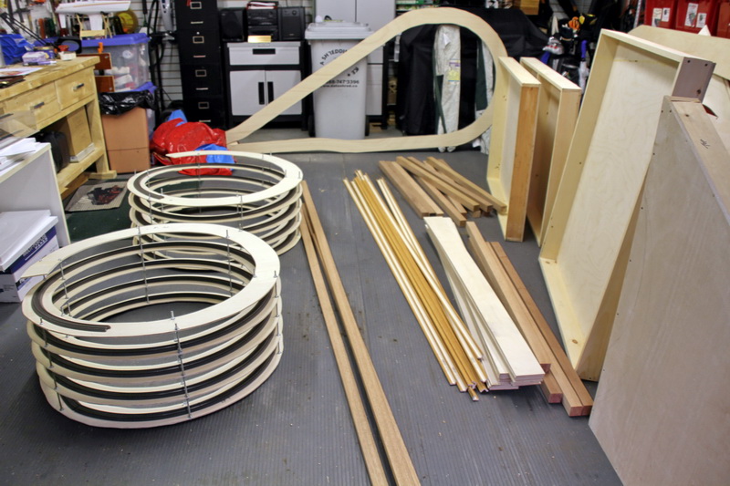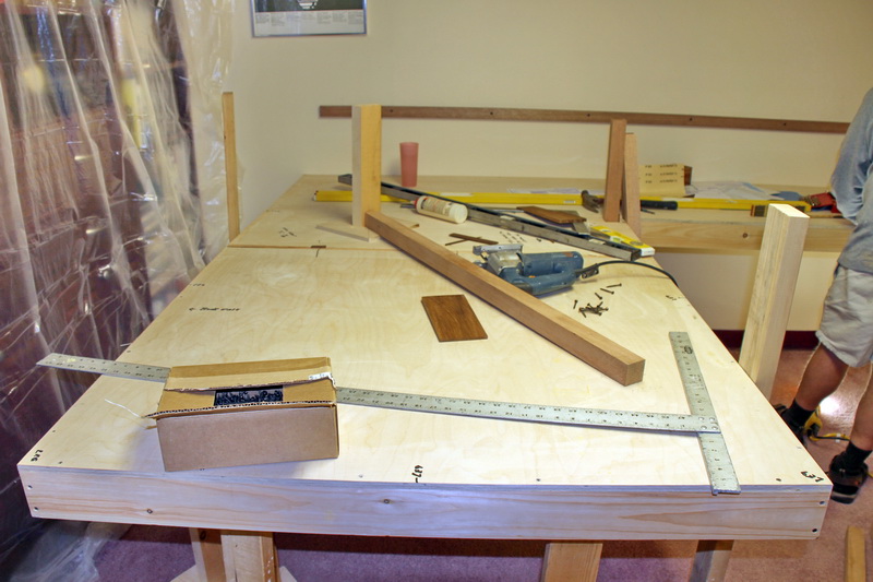 The mahogany wall supports for the lower level and the main level. The separation between these two levels is fifteen (15) inches. The long posts were temporary supports used to install the modules.