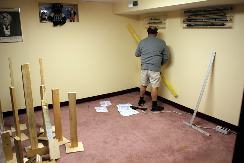 Barry installs the first module - the lower level on the back wall. The module is supported by a temporary posts.