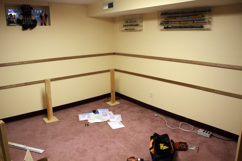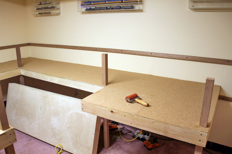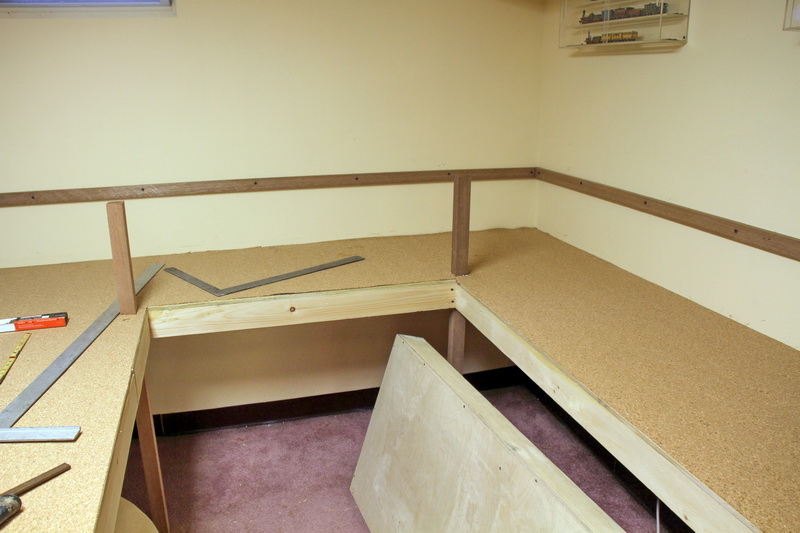 The right upper level installed. Short mahogany posts were used to support the upper level. These posts were eventually covered with thin simulated stone sheets to make them look like stone supports. You will see this in the completed layout photos.