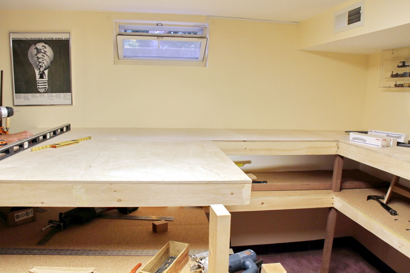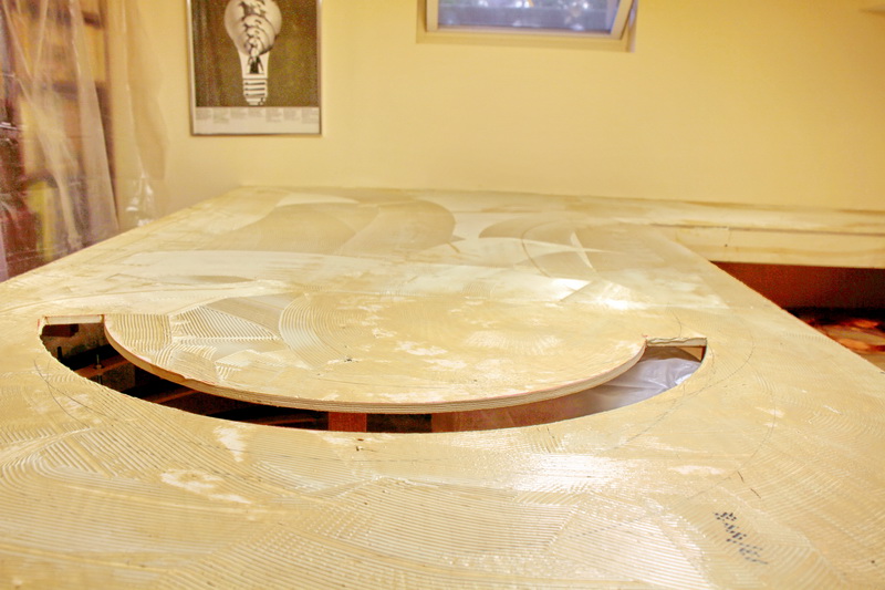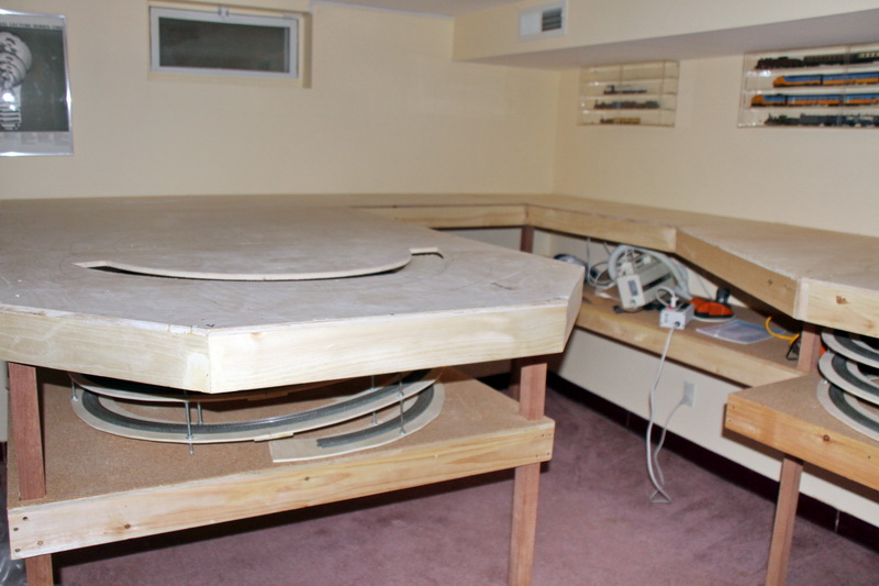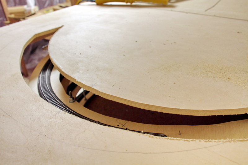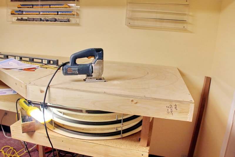The right main level installed. The cut for the helix exit/entry point is about to be made. This helix was eventually removed and replaced with a ramp from the lower level. Trains will go up the ramp and down the remaining helix on the right side of the layout.