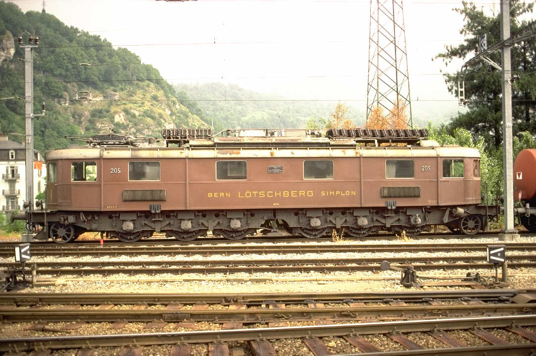 The Bern Lötschberg Simplon (BLS) Ae 6/8 #205 lok passes over the industrial yard switches.