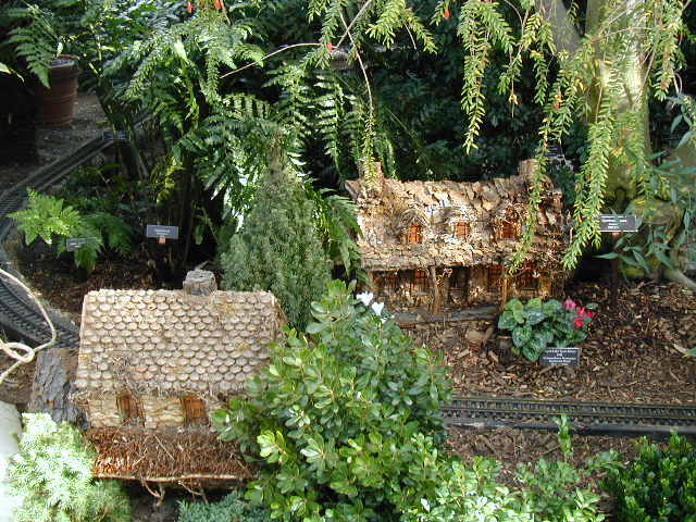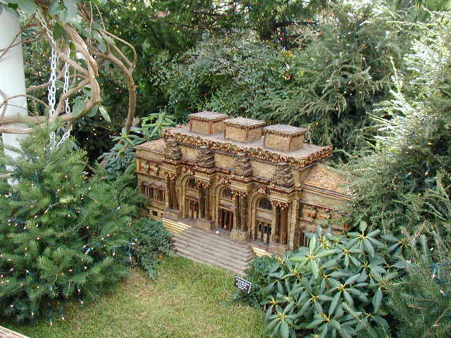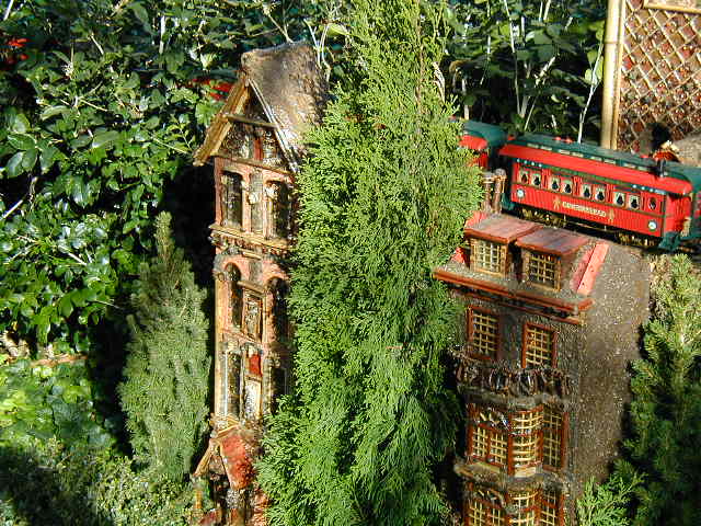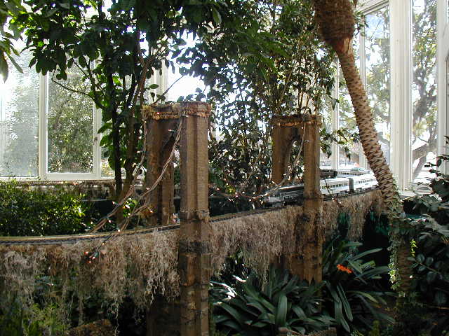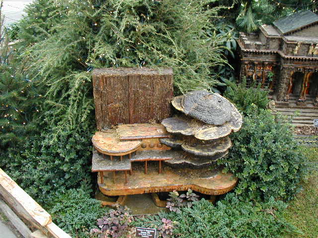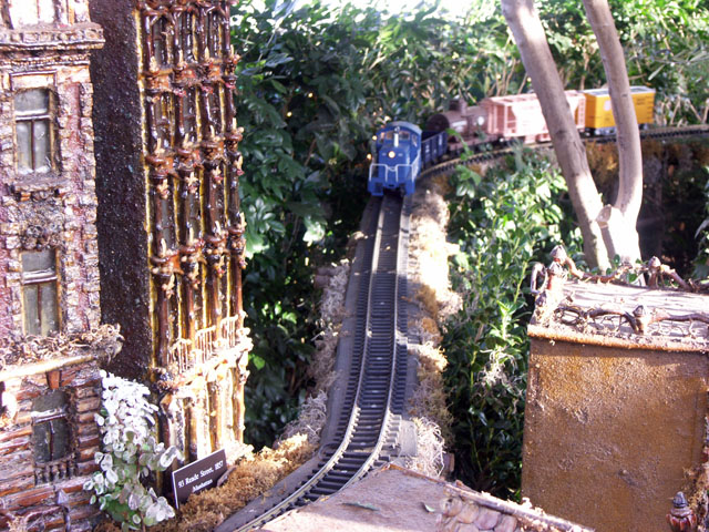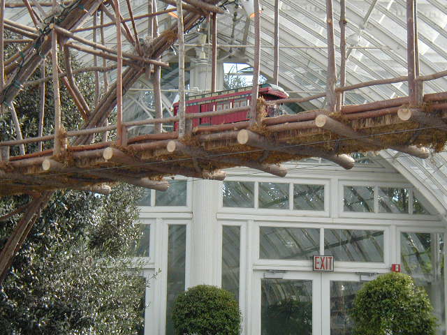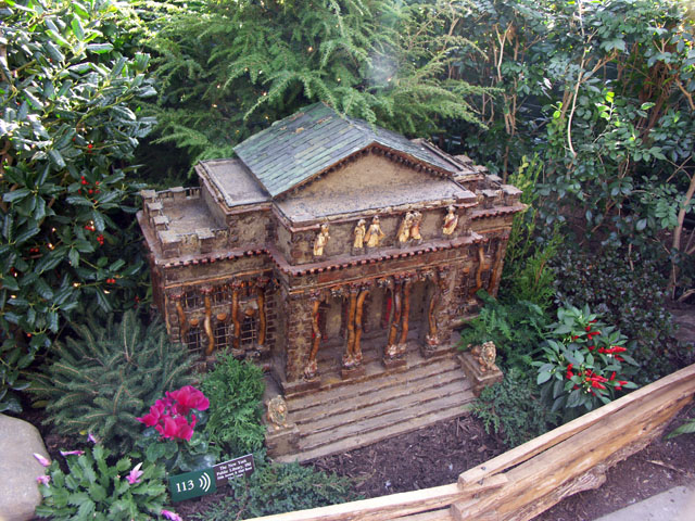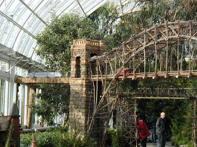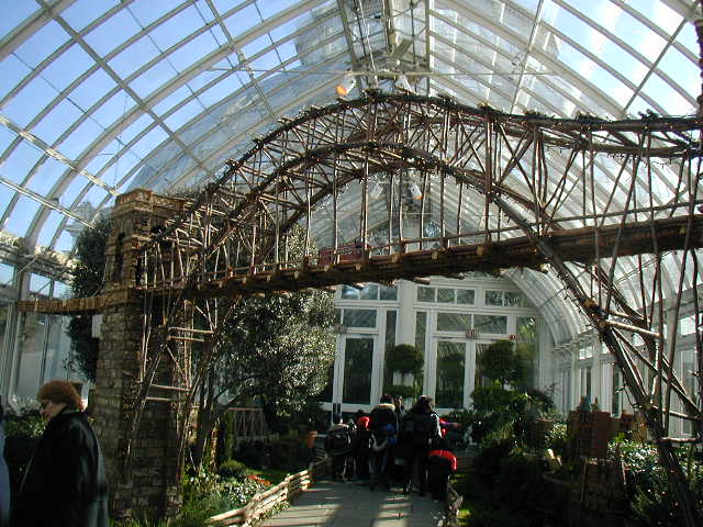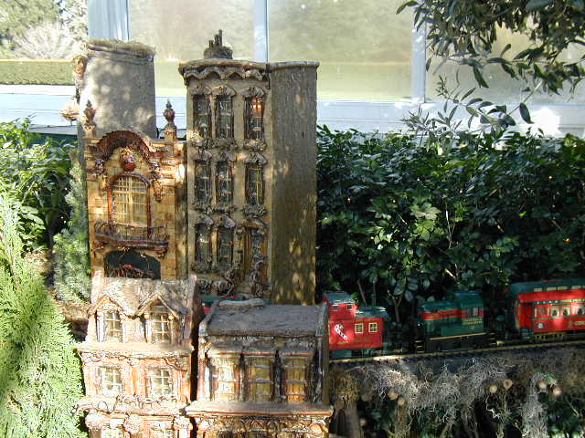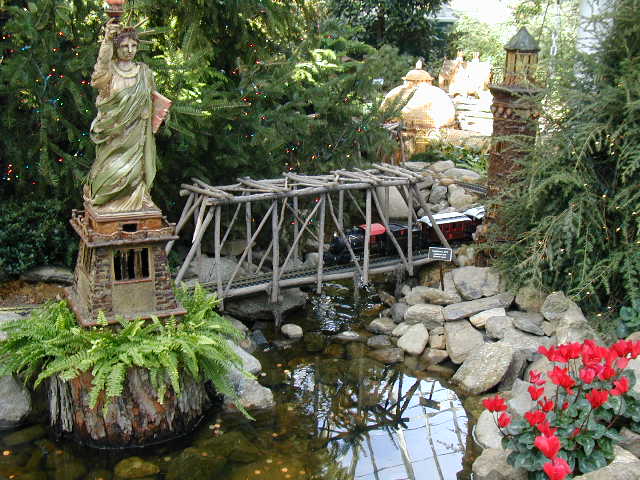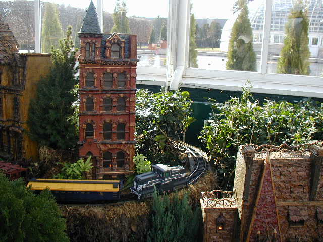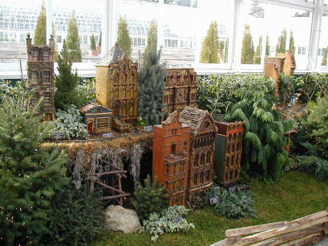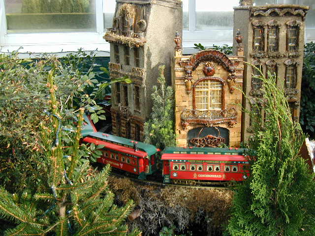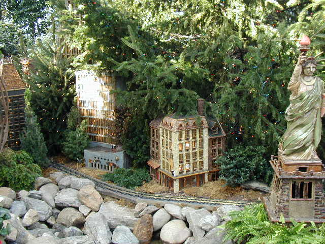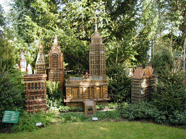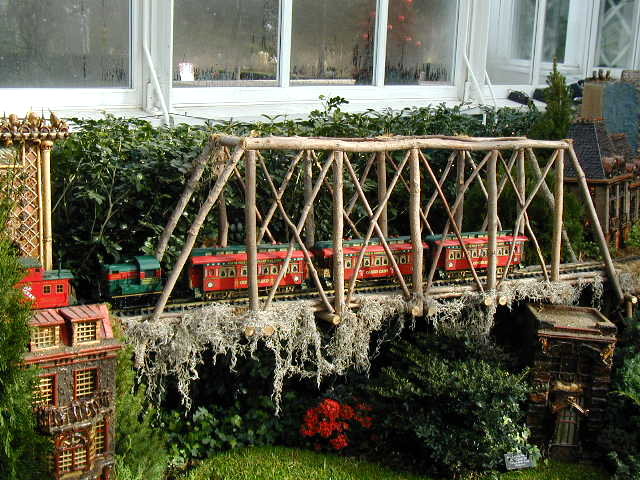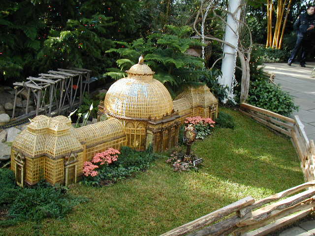 Here are some pictures of the Christmas Toy Train display at the Bronx Botanical Garden in New York City. Each year since its start in 1991 the Garden has a toy train display in its Conservatory. Its designer is Paul Busse who created a similar Christmas display in the U.S. Botanical Garden which is only 1/4th the size of the Bronx display. Busse's layouts are currently on display at Longwood Gardens and the Morris Arboretum in Pennsylvania, the New Orleans Botanical Garden, the Frederik Meijer Gardens in Grand Rapids, Mich., and the Krohn Conservatory in Cincinnati. The trains in all the displays run among the plantings and the bridges and buildings, made of tree bark, vines, roots, seeds and all types of plant parts. The Bronx display represents buildings found in New York City and its environs. New buildings or structures are added each year. In 2004 the Brooklyn Bridge was added. Quite a unique display and well worth a visit if you are in New York during the period of Thanksgiving to the about a week after New Year's Day. I have tried to identify some of the buildings but most are un-named.