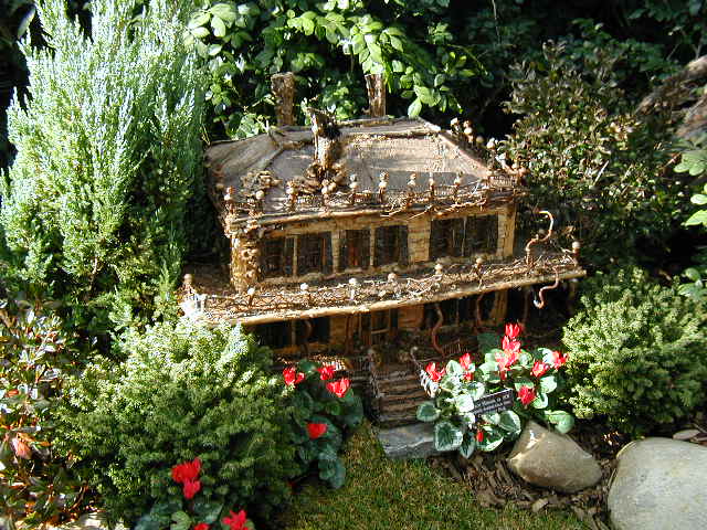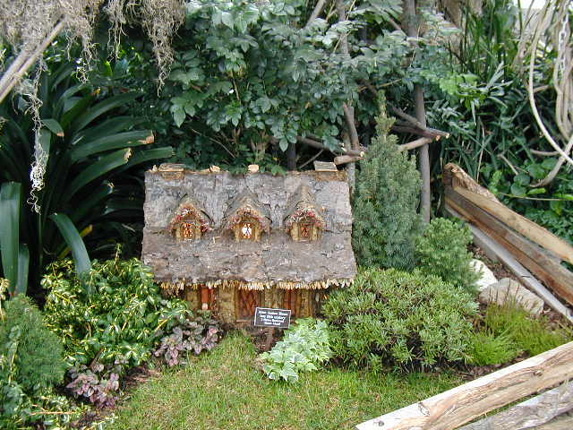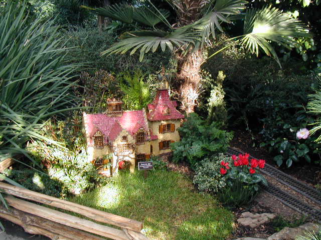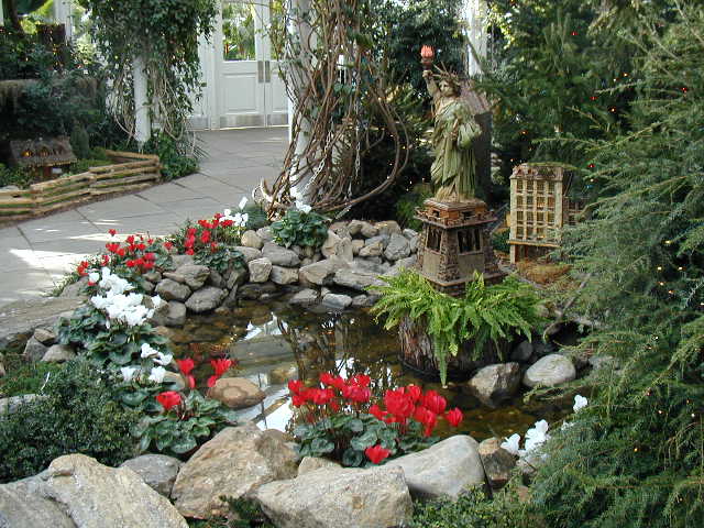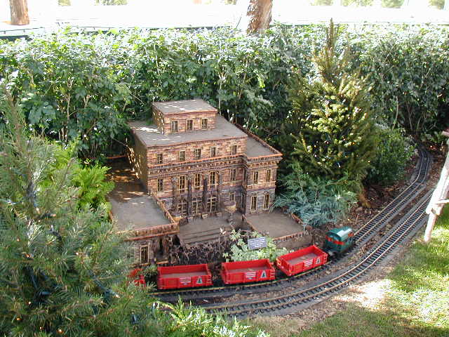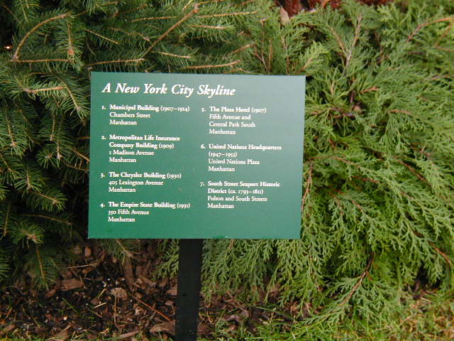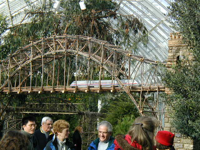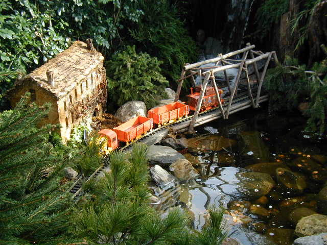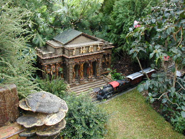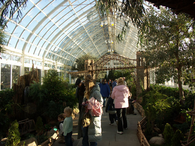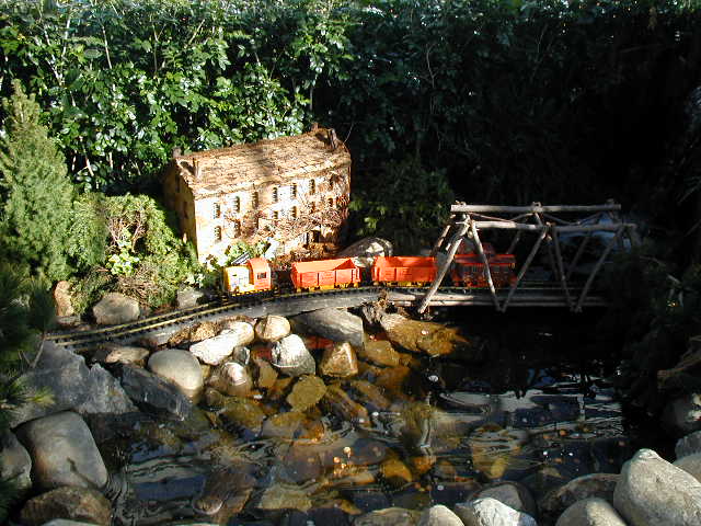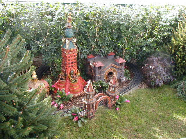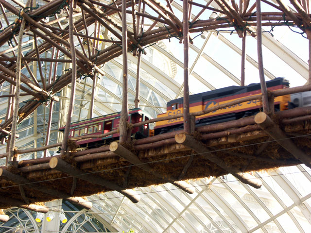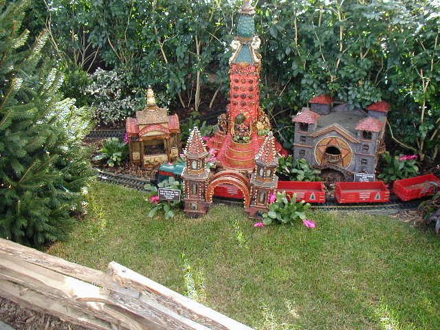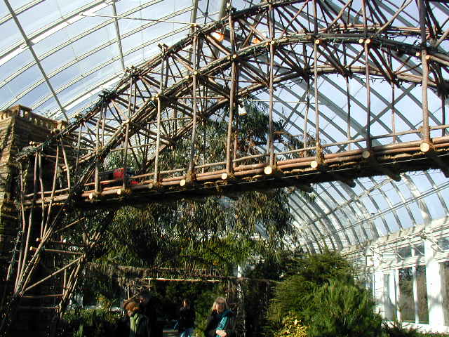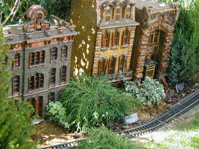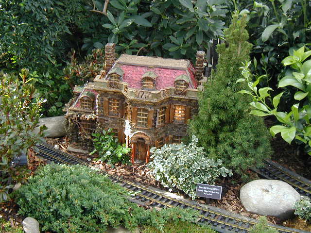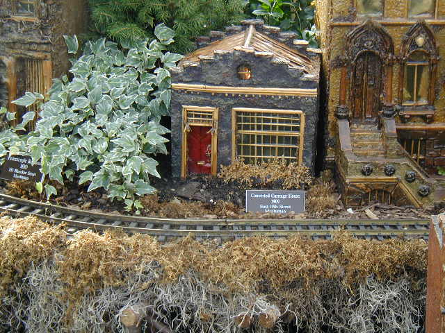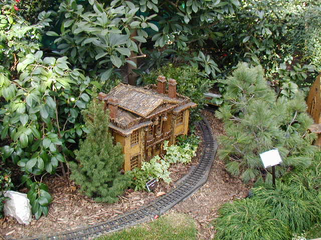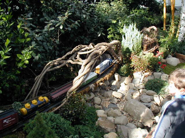 Here are some pictures of the Christmas Toy Train display at the Bronx Botanical Garden in New York City. Each year since its start in 1991 the Garden has a toy train display in its Conservatory. Its designer is Paul Busse who created a similar Christmas display in the U.S. Botanical Garden which is only 1/4th the size of the Bronx display. Busse's layouts are currently on display at Longwood Gardens and the Morris Arboretum in Pennsylvania, the New Orleans Botanical Garden, the Frederik Meijer Gardens in Grand Rapids, Mich., and the Krohn Conservatory in Cincinnati. The trains in all the displays run among the plantings and the bridges and buildings, made of tree bark, vines, roots, seeds and all types of plant parts. The Bronx display represents buildings found in New York City and its environs. New buildings or structures are added each year. In 2004 the Brooklyn Bridge was added. Quite a unique display and well worth a visit if you are in New York during the period of Thanksgiving to the about a week after New Year's Day. I have tried to identify some of the buildings but most are un-named.