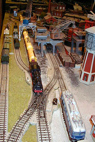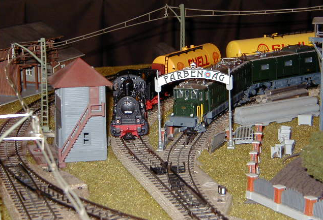The rail entrance to the Farben factory with an Ae 8/14 waiting on a siding.