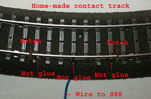 I have also made contact tracks out of single C tracks, any length and any shape. I hot glue the outer rail, which is very important any lenght of track but especially on short track sections, and then I cut two notches on the same outer rail with a Dremel tool. Then I make a notch on the underside of the track under the same outside rail. I insert the bare end of a wire into this notch. I press the wire into the slot or notch to ensure good contact and then hot glue it. This is actually easier to do then the first method and works just as well. This second method allows greater flexibility on a layout.