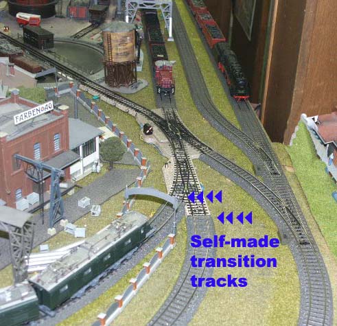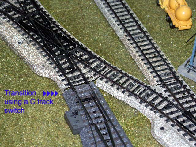 I have complex switching configurations which didn't allow me to use the only M to C transition track which is a straight track. I found a simple way to make any C track, including switches, a transition track. I used a Dremel tool and a thin cutting disk to do this.