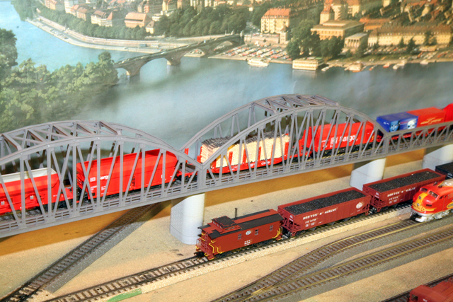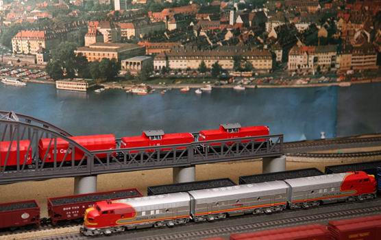 The Bakers chocolate cars are a part of the Santa Fe Red Bonnet consist which is on a siding below the trestle. As you can see I enjoy running loks that I like. To say my layout is eclectic would be an understatement.. Click on picture to return to description.