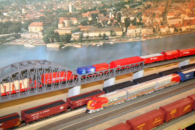 The DB Cargo loks passing the torpedo car which is on a siding below the tresle. Click on picture to return to description.