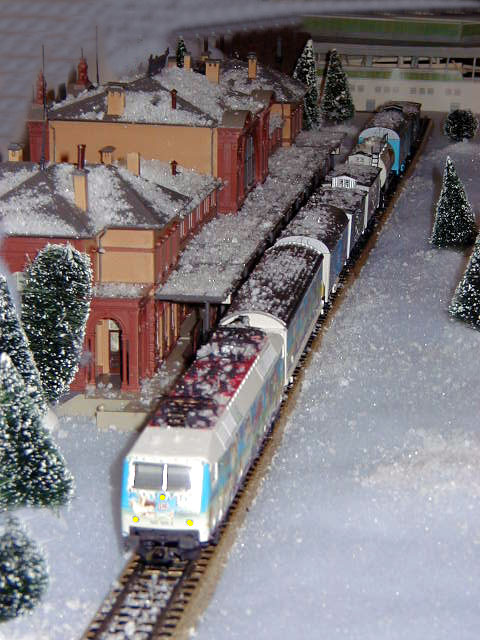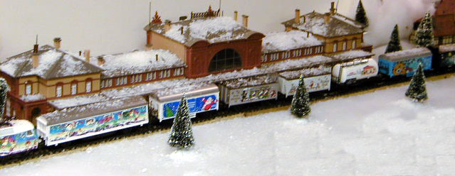 The BR 120 Christmas Engine (Märklin 37531) lok with some Christmas cars - Bonnes fêtes.
