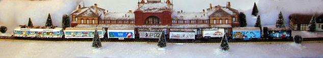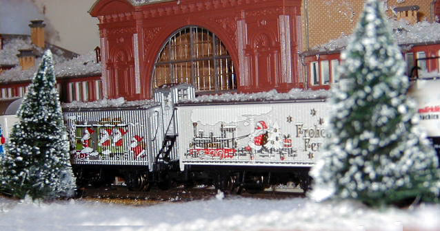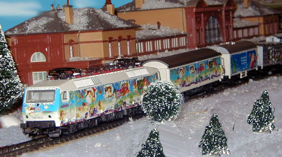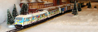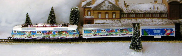 The BR 120 Christmas Engine (Märklin 37531) lok with some Christmas cars - Joyeux Noel.
