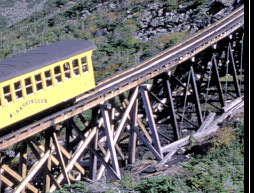 ictures of the Mount Washington Cog Railway including engines, cars, tracks and switches (turnouts). This is the oldest cog railway in the world. It was started in 1866 and first ran in 1869. It takes passengers from a base station to the top of Mount Washington, 6,288 feet, in New Hampshire. Mount Washington is the highest peak on the east coast. It has the worst weather in the United States because of its height and the winds and storms that frequent this peak. The Cog Railway still uses steam driven engines.An engine uses 1,000 gallons of water on each trip and one ton of coal. The steepest grade is 37.41% at Jacob's Ladder which is a tresle 25 feet above the surface. At his point a person standing in the front of the passenger coach is 14 feet higher than a person standing in the rear of the coach.
