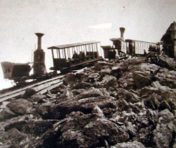 ictures depicting some of the history of the Mount Washington Cog Railway the first cog or rack railway in the United States, begun in 1866 and first operated in 1869. It is the first and oldest cog railway in the world. There is another famous cog railway in the United States, the Pike's Peak Cog Railway (14,410 feet high) which is just outside of Colorado Springs, Colorado. The engines on this cog railway were originally steam but have now been converted to a Swiss type cog railcar. Pike's Peak Railway uses the Abt rack system. The maximum grades are 25%, which is about the upper limit for the Abt system. Many rack railroads use the Riggenbach system, also called "ladder rack". The steepest cog railway in the world is the Mt. Pilatus Railway in Lucerne, Switzerland. It uses the Locher rack system to climb grades of 48% !I have added links to both the Mount Washington Cog Railway and the Pike's Peak Cog Railway.