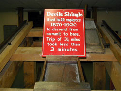 ictures of sledding on the Cog Railway. Originally workers would use these wooden sleds to come down the mountain. The descent usually took 15 minutes but some could descend the 3¼ miles in less 3 minutes - more than 60 miles an hour. These sleds were called "The Devil's Shingle". Later, visitors tried the sledding and it became something of a sport. When a worker was killed on a slide board in 1906, their use was stopped.