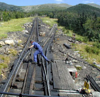 ictures of some switches on the Mount Washington Cog Railway. Each switch has 9 working parts. Most railroad switches have one or two working parts. Switches on the Cog Railway are set manually. The brakeman gets out and sets each part of the switch. Note in the pictures that the center cog rack has to be set as well as the outer rails. Quite a sight to watch this being done. At the end, the brakeman counts the points that he has set and it better be nine or there will be trouble.