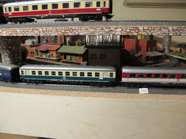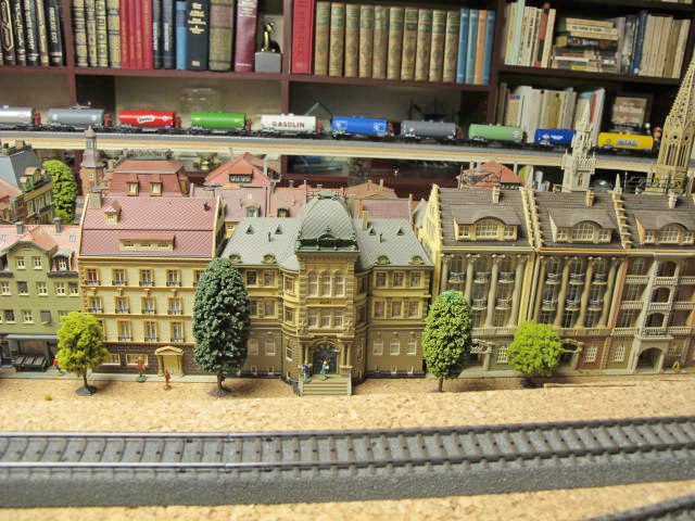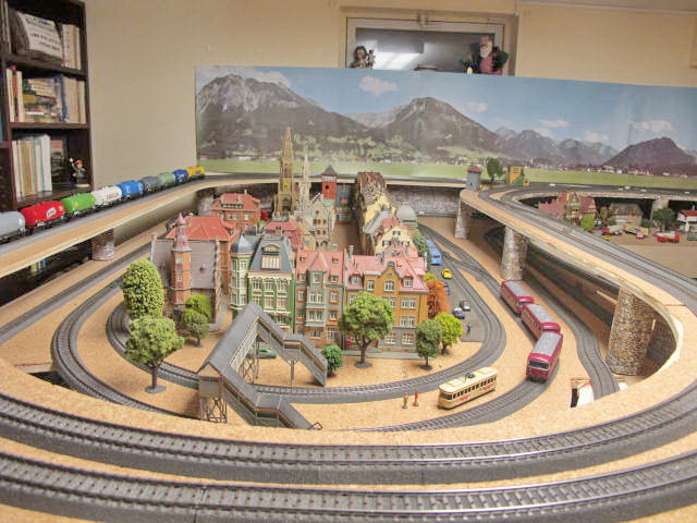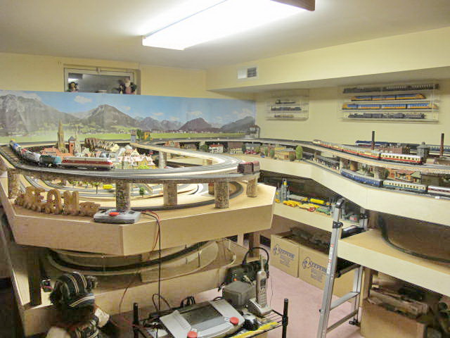 The entire layout. Note the display cases are still mounted. They will be removed and replaced with background. Also note the Central Station and one Mobile Station. The entire layout is powered and controlled by two 60 VA transformers and the Central Station and one booster. I already have run 10 trains at the same time - 4 on the upper level, 4 on the main level, and two on the lower level.