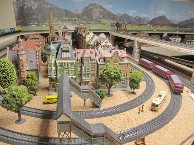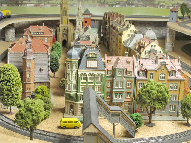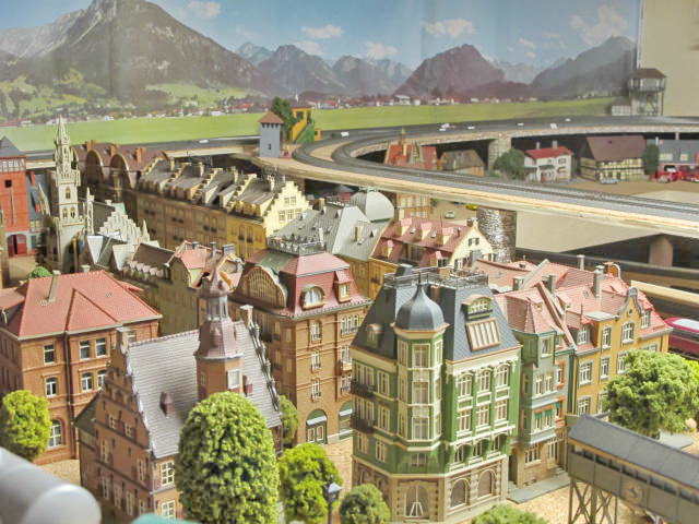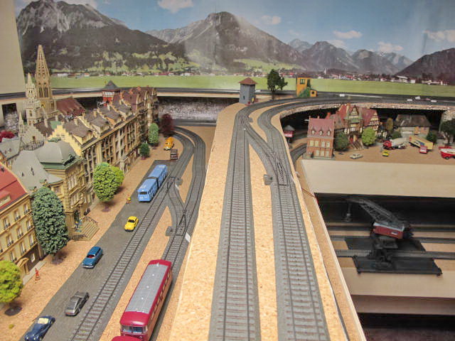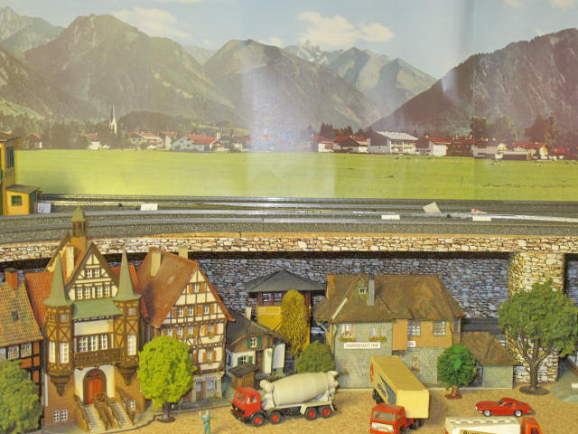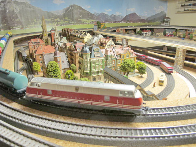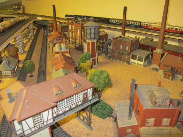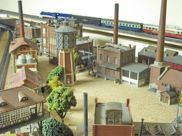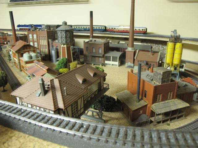 The completed layout. Call this a minimalist's layout. There are just enough buidings and accessories to make it look nice but the layout's main purpose is to run trains, consists, and routes.
