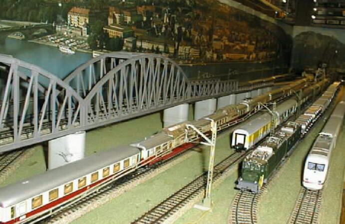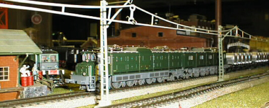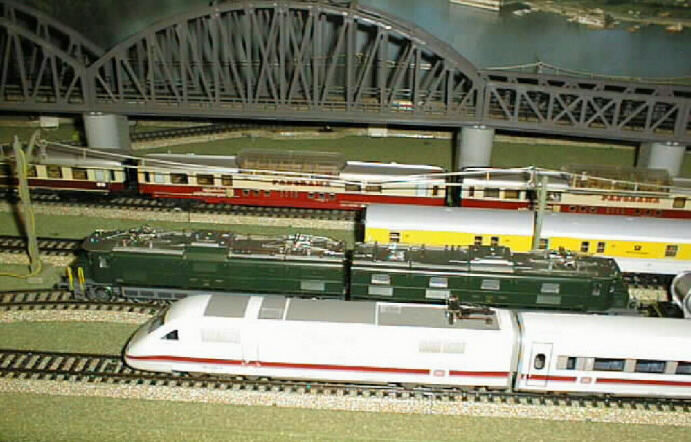 The Swiss Federal Railways (SSB) Ae 8/14 and an ICE train on the mainlines.
