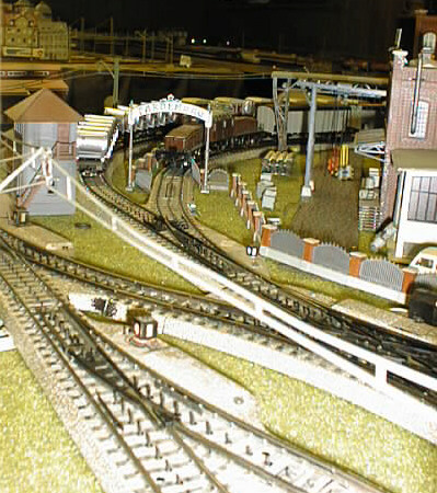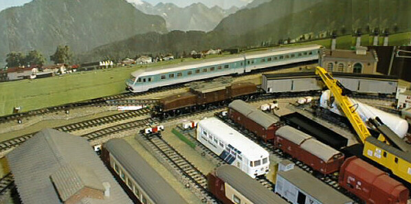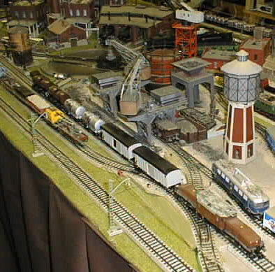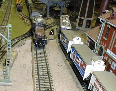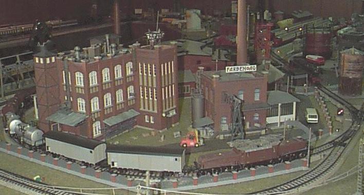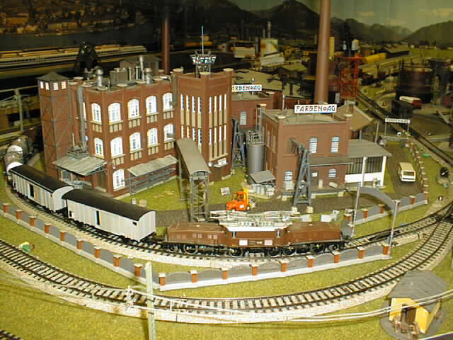 An SBB crocodile at the Farben AG factory with a consist of Swiss freight and tank cars.
