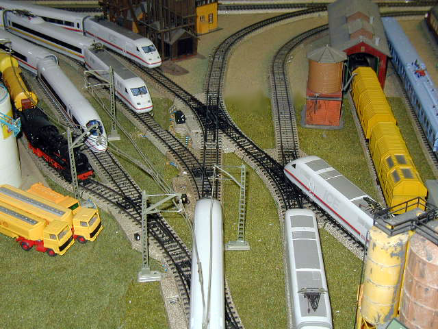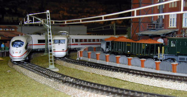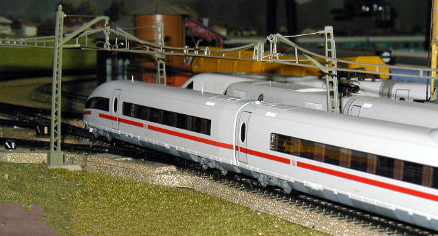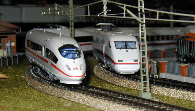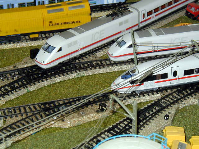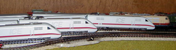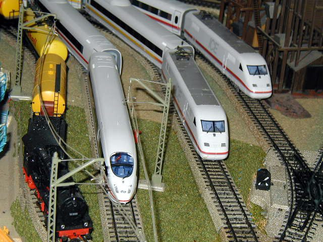The DB ICE 3 (Märklin 37780)on the mainline passes an ICE 2 (Märklin 37701) and the Elisabeth ICE 2 (Märklin 3750).