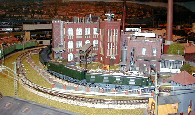The Roco Ae 8/14 Landi-Lok passes the Farben factory where a Märklin Ae 8/14 sits on a siding with a consist of empty hopper cars.