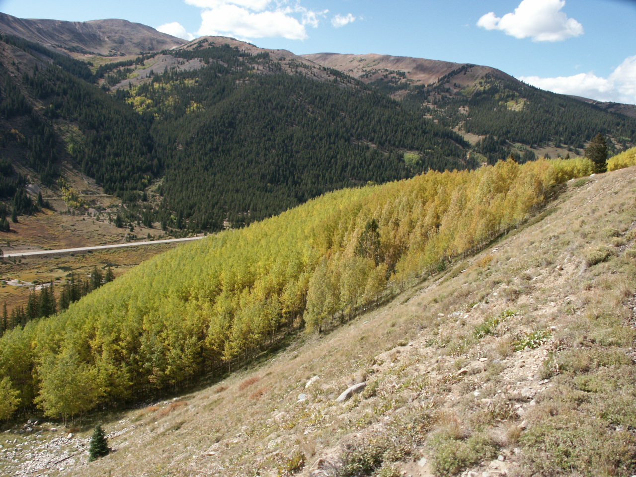 Over a grade of 4% we have climbed quite high above the valley just outside of Leadville. The road runs north to Copper Mountain and Interstate 70, an east-west road through the Rockies that will take you over the continental divide. Click on picture to return to description.