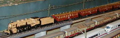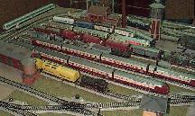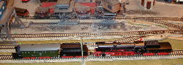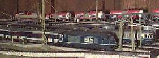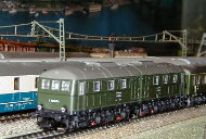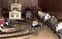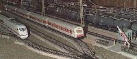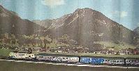 his is a view of one of the sidings with a (Märklin 3655) S-Bahn commuter train on one of the sidings. It is pulled/pushed by a (Märklin 3655) DB class 111 electric engine. These commuters are used in the Rhine-Ruhr region. In the lower left is the (Märklin 3750) Elizabeth ICE train. In the background is a consist of VTG tank cars being pulled by a (HAG 240) BLS Ae 8/8.