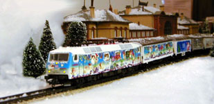 everal scenes showing the Märklin Idee+Spiel 'Graffiti train. It consists of a BR 111 engine and three passenger coaches. Each coach and the engine are painted with graffiti. The last coach has a control cab. The scene is the background used along the backwall for the center section of the layout.