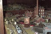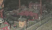 his a a factory scene with a consist, pulled by a (Märklin 3652) Swiss Crocodile, waiting on a siding to be loaded. The roundhouse and turntable are just behind the factory.