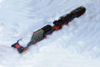 ictures of the Insider Rotary Snow Plow (Märklin 26830) being pushed by Condenser steam lok (Märklin 37171). This is a fantastic combination suggested by Ricky on the MML. The snow plow has rotating blades, a set of working lights and a single head lamp, doors and a chute that can be manually set for throwing the snow right or left and it has realistic sound. Suethe #11 smoke units can be added to both the snow plow and the lok for more realism. Märklin did a great job on this one. There are pictures of the Snow Plow moving through snow drifts.
