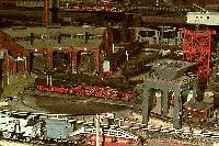 gas tank and coaling station make up part of this scene in the industrial part of the layout. Two (Märklin 3720) pneumatics can be seen next to the roundhouse. Two cranes, one used for engine repair and the other as part of the coaling station, partially obscure the (Märklin 3683) freight-car engine and the (Märklin 3426) Belgian railcar.
