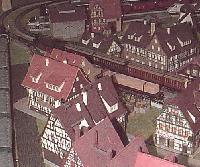 view of the village section with two passenger trains, one pulled by a (Märklin 3609) Prussian steam tank engine and the other by a (Märklin 3412) tank engine. A saw mill with a DB (Märklin 3680) Köf II diesel engine and a consist of lumber cars on a siding adjacent to it is in the center of the picture. The Köf II and the mill itself are hidden from view.