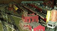his is a view of the back of side of the roundhouse and the three sidings that are adjacent to it. The sidings connect to the turntable. The (Märklin 3426) Belgian VT 651 railcar runs a route that brings the turntable to its siding; it enters the turntable; the turntable returns to the main line, the railcar runs a route around the layout returning to the turntable; the railcar is returned to its original place, ready for its next run. The factory is in the background.
