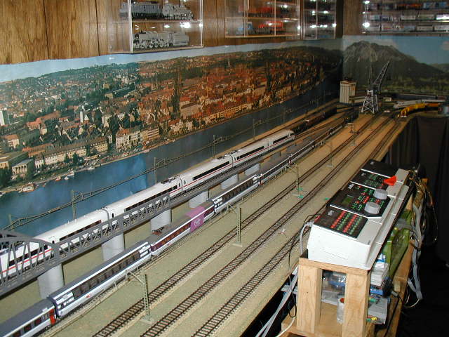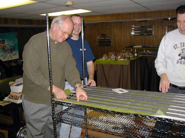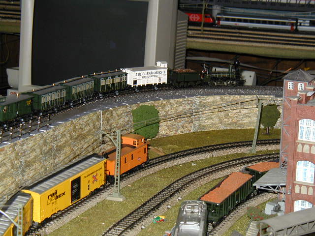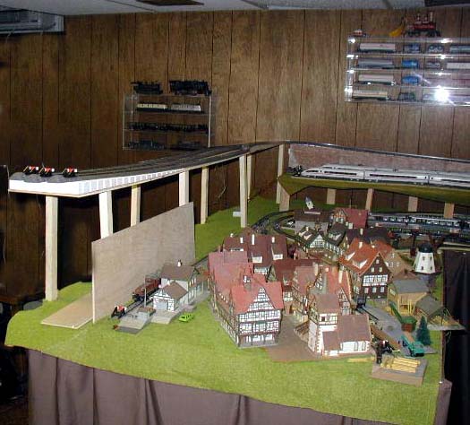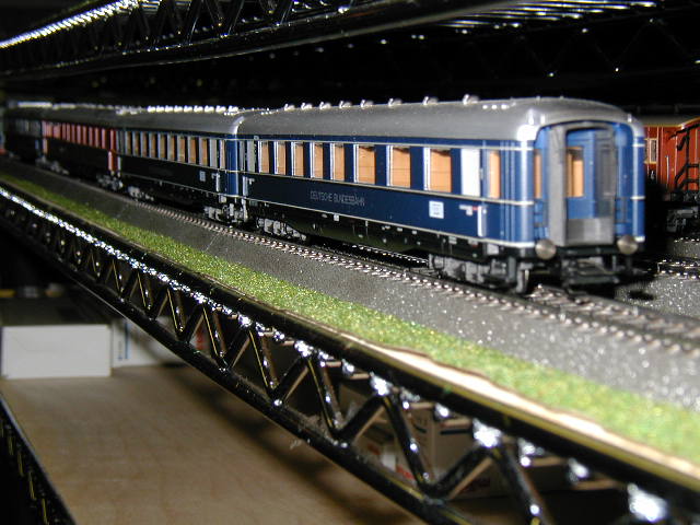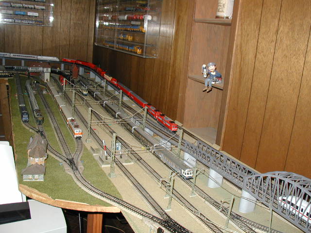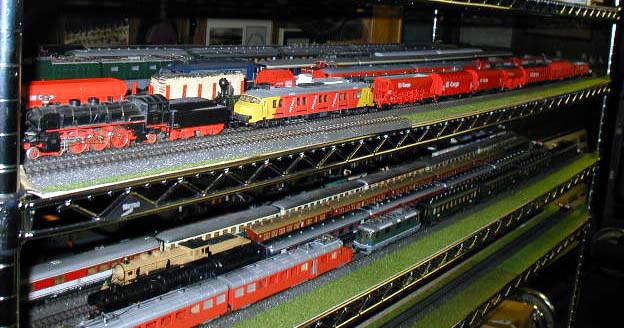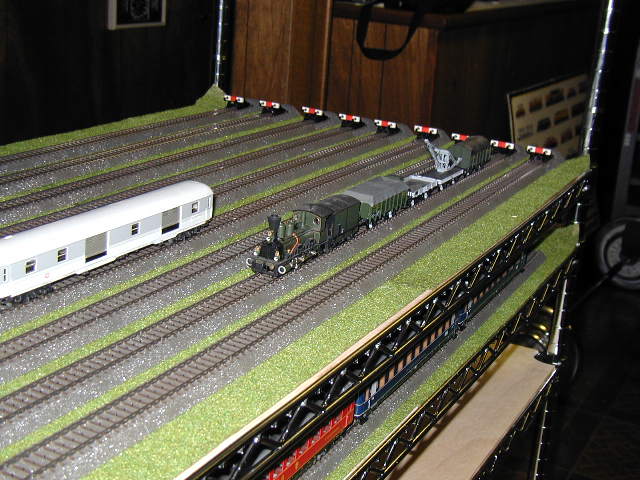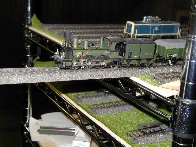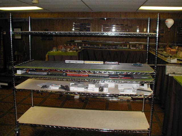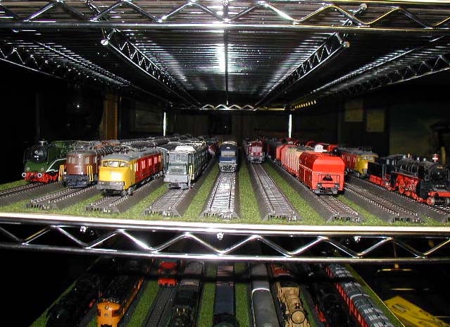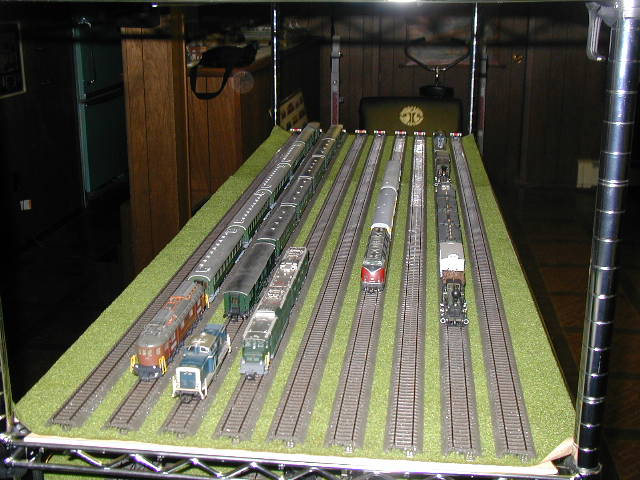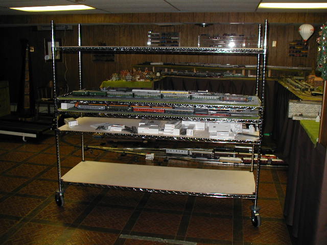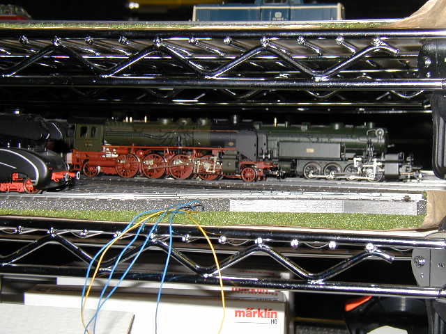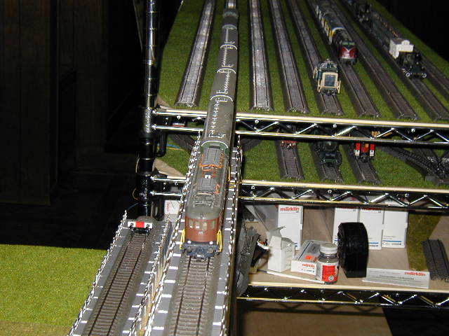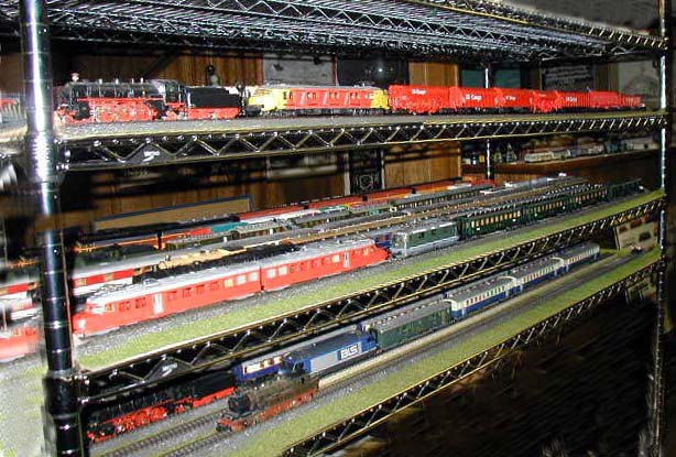 What I needed was to find a way to expand my collection and to be able to run both my new and my older loks on the layout. So I have designed and built a moving storage yard with three levels. I purchased a rack from the Grainger Company (Bryan Adams, a fellow Marklin enthusiast works for the company) consisting of five easily movable (up/down) shelves, made of chrome stainless steel, and on wheels. The rack is 60 inches high and each of the five shelves is 72 inches by 24 inches giving me plenty of additional storage space. The shelves are easily movable up and down which makes it very versatile.