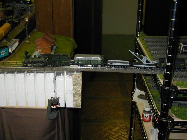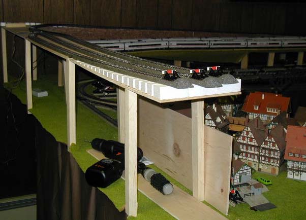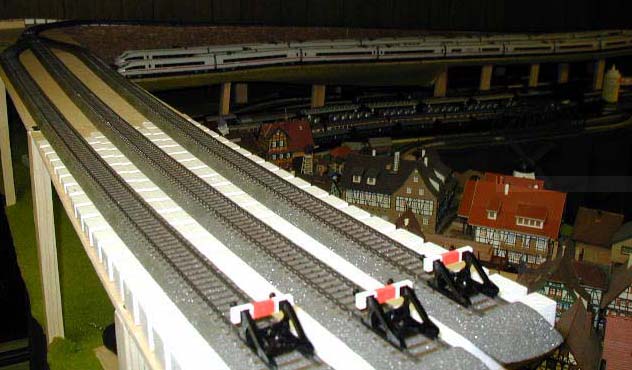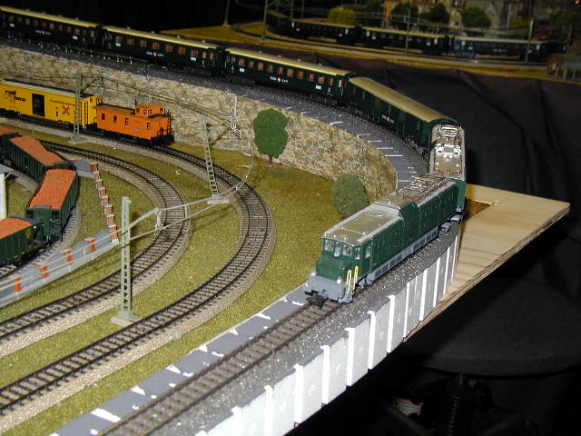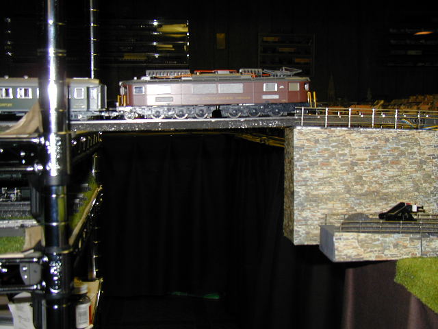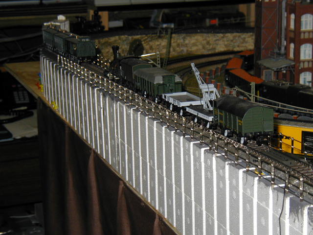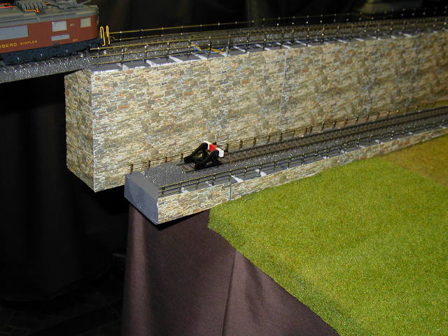 To reach the upper level shelf I built a 4% grade ramp which rises 6 inches above the layout. I added a stone facade to the ramp and railings to make the ramp more realistic.