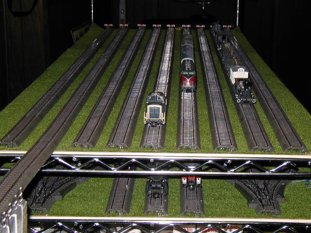 I covered each shelf with 1/4 inch plywood so that I could screw the C track to the board. I now have 18 storage sidings, each 6 feet long. Great for long consists that you don't want to separate.