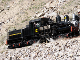 ictures of Georgetown Loop Railroad, a privately operated narrow gauge railroad for excursions from May to September. The railroad originates at its terminal station in Old Georgetown, Colorado (Devil's Gate), which is 50 miles west of Denver just off Interstate 70. Silver Plume is only 2 miles from Old Georgetown but the route is 4 1/2 miles because of the need for many switchbacks. These allow the train to rise 600 feet since Silver Plume, Colorado is at a 600 ft. higher elevation. The round trip ride takes 1 hour and 10 minutes. The route is along a single track (tracks are 3 ft wide) with plenty of switchbacks. The route takes you through a beautiful forest with great views of the surrounding mountains. The engine is an oil-fired shay. It pulls the consist up and down but it faces the same way up and down. The cars are both open and closed. Ride in the open cars. A trip well worth taking.