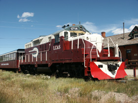 ictures of Leadville Colorado and Southern Railroad, a privately operated railroad for excursions only from May to September. The railroad originates at its terminal station in Leadville, Colorado. The route rises almost 800 feet on its 20 mile route. The route is alone a single track toward Copper Mountain. The routes takes you along a ridge with an extraordinary view of the valley below. The Leadville, Colorado & Southern Railway still follows the headwaters of the Arkansas River up to a spectacular view of Fremont Pass, then back down to French Gulch Water Tower, where the train stops to view Mount Elbert, Colorado's highest snowcapped peak, wildflowers and the scenic beauty of Colorado. The diesel lok pushes the consist up the mountain and pulls it back down. I rode in the cab on the way down.