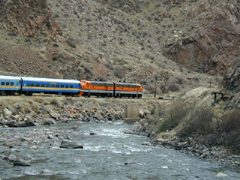 ictures of Royal Gorge Railroad, a privately operated railroad in Cañon City, Colorado. The railroad originates at its terminal station in Cañ City, travels along the scenic Arkansas River gorge to the Royal Gorge Bridge and returns to the station. The Royal Gorge Bridge is the highest and longest suspension bridge in the United States. The ride is two hours over 24 miles of track. After the train ride, it is worth going to the bridge by car and crossing it by foot or car. The AB locomotives are F-7 diesel electrics. You can ride in the cab. See my pictures from the cab.