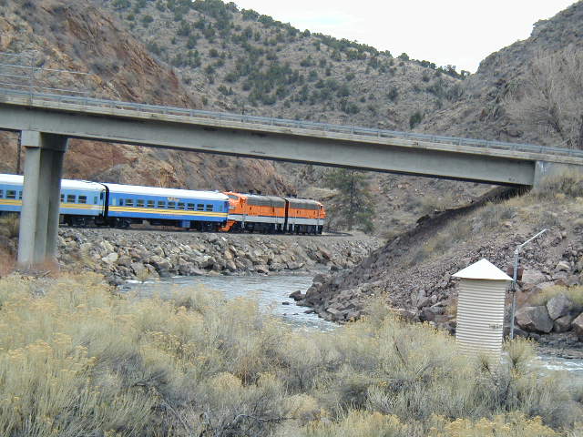 About to cross a bridge built by the orginal railroad, the Rio Grande, that once used these tracks. The Santa Fe then used the tracks and now it is the Royal Gorge RR. Click on picture to return to description.