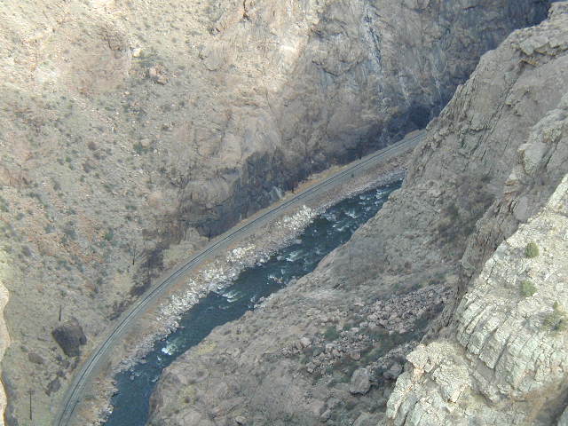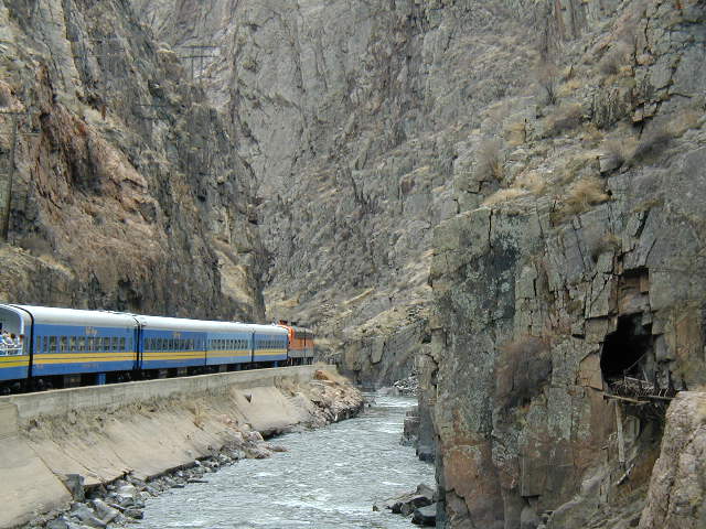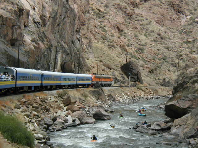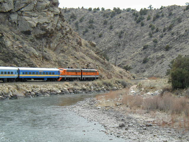 The Royal Gorge Railroad tracks follow the Arkansas River which has its headwaters near the Leadville Colorado & Southern RR. Click on picture to return to description.