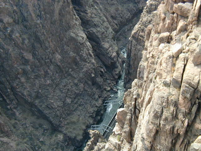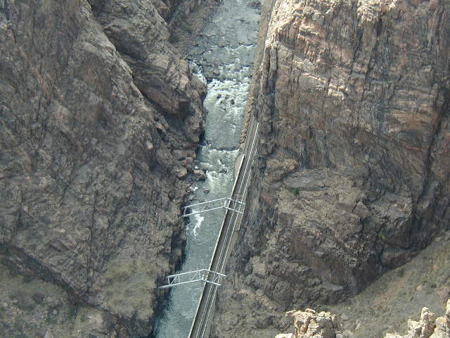 Looking down 1,000 feet from the Royal Gorge Bridge to the track suspension bridge. Click on picture to return to description.