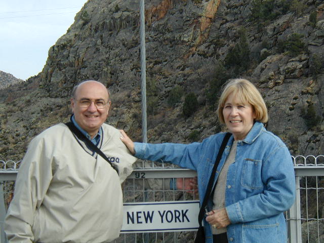There are signs for each state on the bridge. My wife and I standing next to the New York State sign. Click on picture to return to description.
