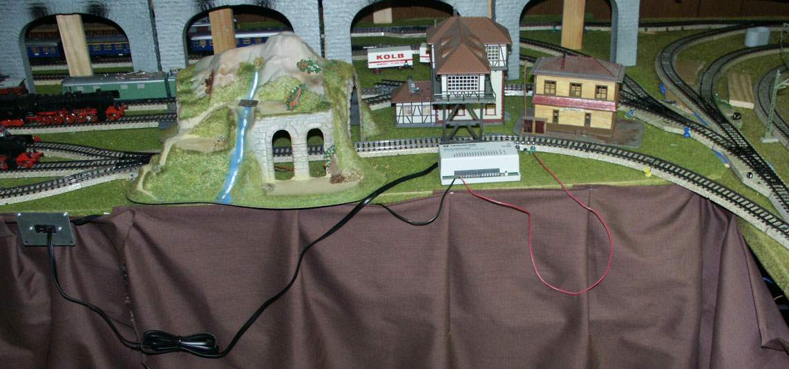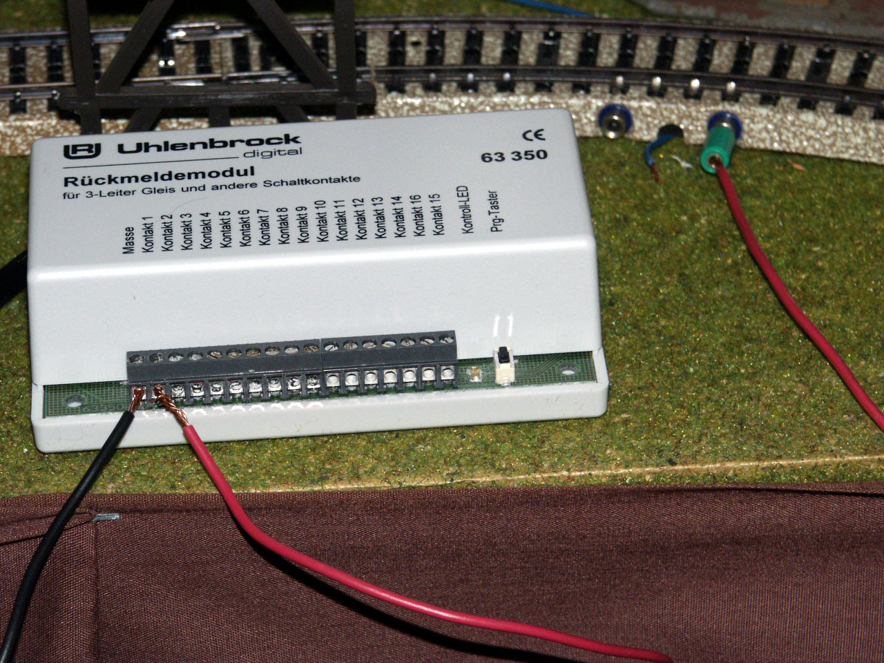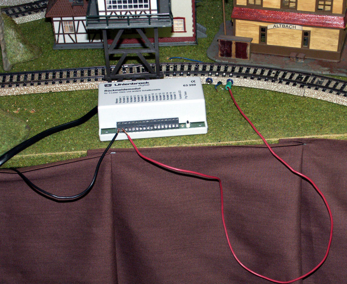 The Uhlenbrock S88 (63 350) attached to a contact track for testing purposes. The unit will be mounted under the layout for regular use. The unit is connected to the LocoNet with a six wire cable, the black ground wire is connected to the common ground and the red wire is connected to a contact track.