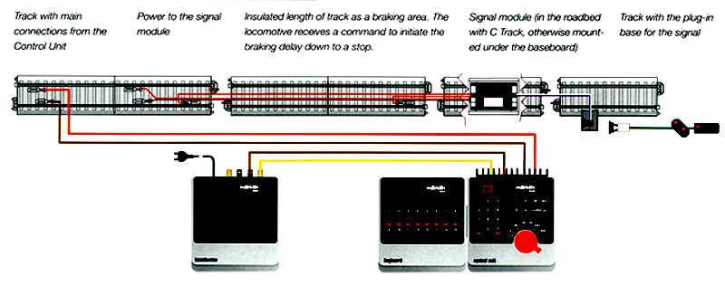 These signals have a built_in decoder in the signal's LED(s) and an electronic unit which fits under C track which reduces the amount of under-layout wiring. The only under-layout wiring I needed was running the yellow and brown wires to a near-by distribution socket wired for my signals and turnouts.