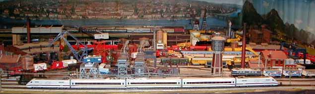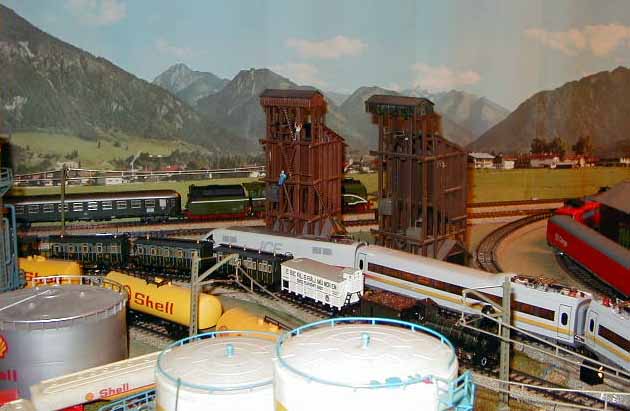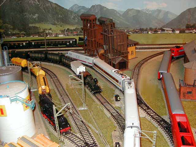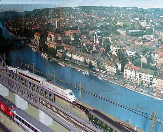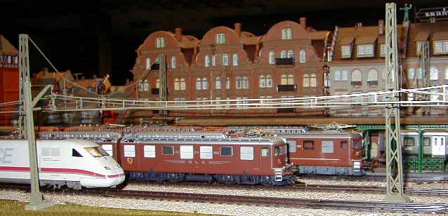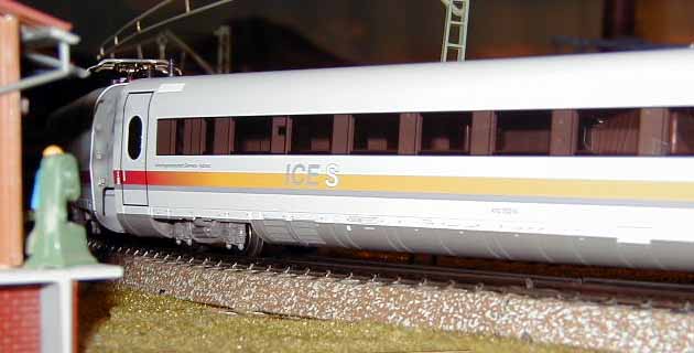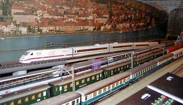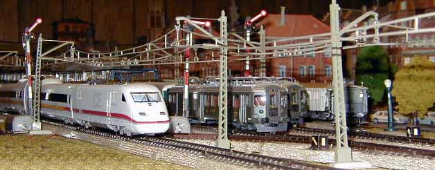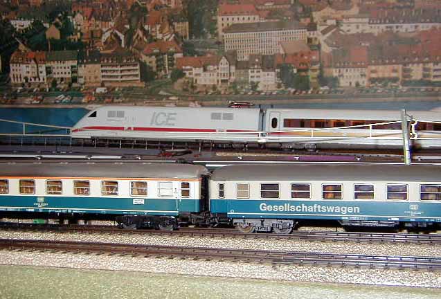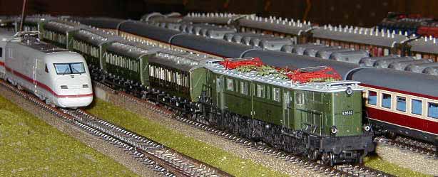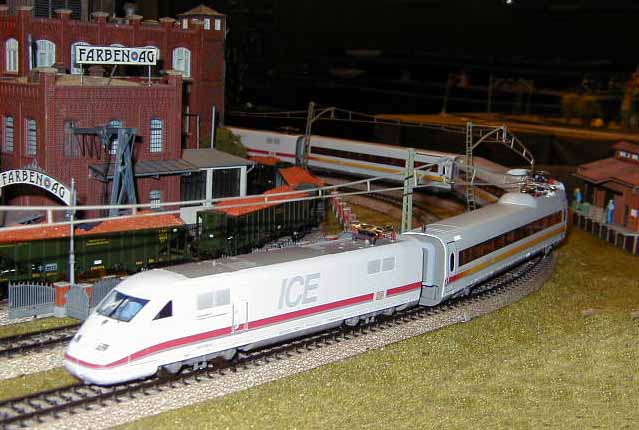 The ICE Sine train is about to pass the Brawa E95 as it waits on a siding.