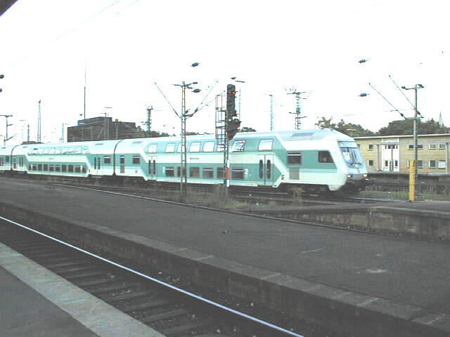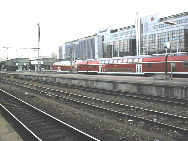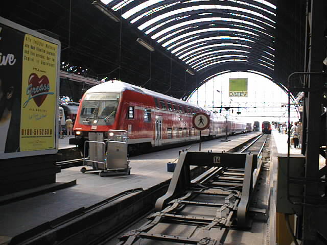 A bilevel arrives on Gleis 13 in the Frankfurt Hauptbahnhof.