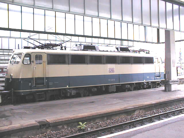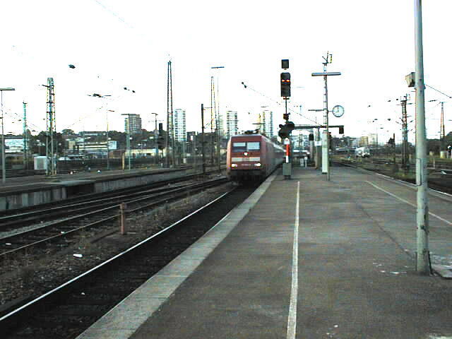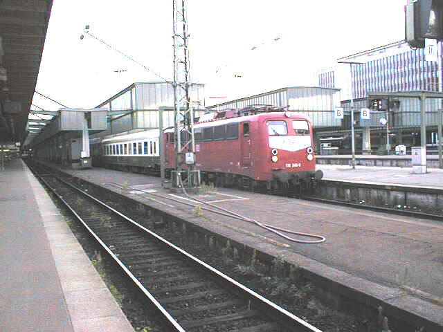 An IR pulled by a 140 arrives at the Frankfurt Hauptbahnhof.